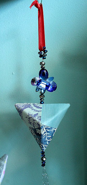 Handmade one-of-a-kind ornaments combining origami, beadwork, and vintage jewelry.